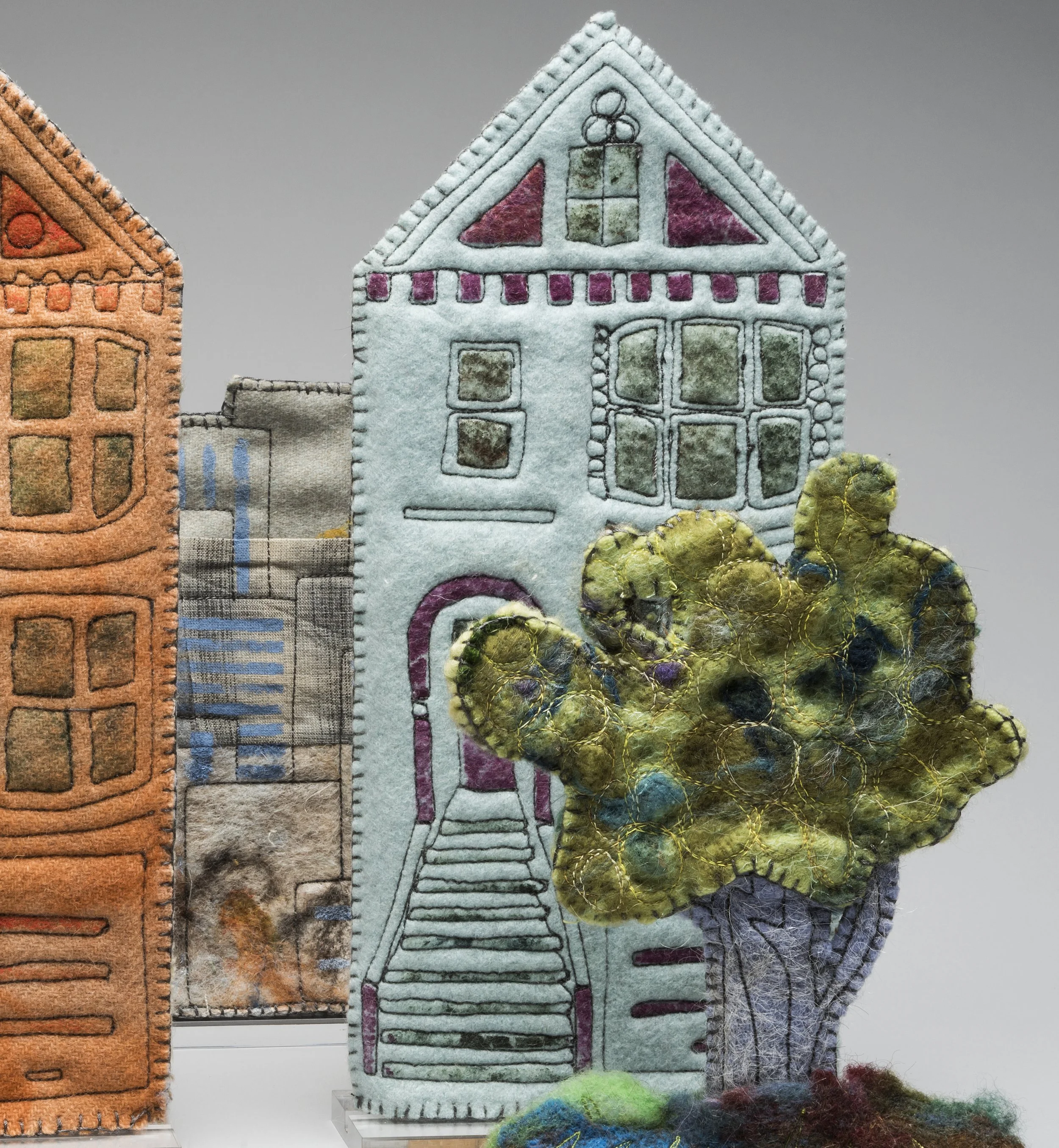 Unique in the field of art quilting, Jennifer uses knit and felted wool as a signature element in her work. Her pieces can be seen at Studio Art Quilt Associates (SAQA) exhibitions as well as in local shows. She regularly contributes articles about her work in Art Quilting Studio magazine.