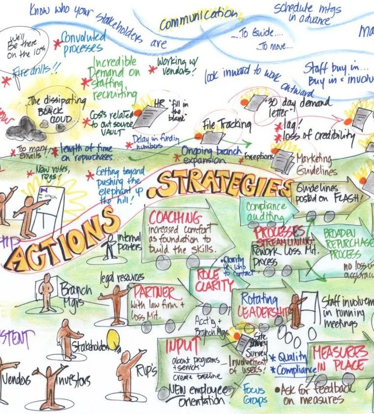 Guide conversations and map presentations in real time with Graphic Facilitation. With large paper on a wall, participant comments are captured in text and simple images, building on and making connections between ideas. Services range from local half-days to multiple-day offsites. Please email for rates and availability.